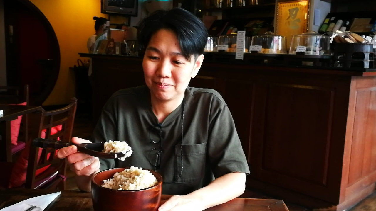 "ที่ร้านใช้ข้าวกล้องหอมมะลิ ถ้าหุงใช้น้ำเยอะไปข้าวจะบานแต่ไม่แฉะ แต่ถ้าหุงน้ำไม่มากพอข้าจะไม่แข็งเป็นไต แค่จะเด้ง หุงเสร็จเปิดฝาออกมาหอมมาก ถ้าเอาข้าวกล้องอินทรีGreen Net มาผัดก็ยังหอม เวลาทานก็จะหนึบ ข้าวเต็มเมล็ด